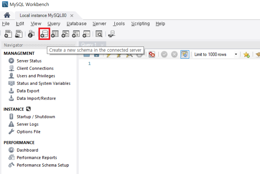 왼쪽 Navigator에 Administration과 Schemas가 있는데 Schemas를 누르면 생성한 test_example 스키마를 확인할 수 있다. 만약 생성한 스키마가 보이지 않을 경우 새로고침 아이콘을 누른다.