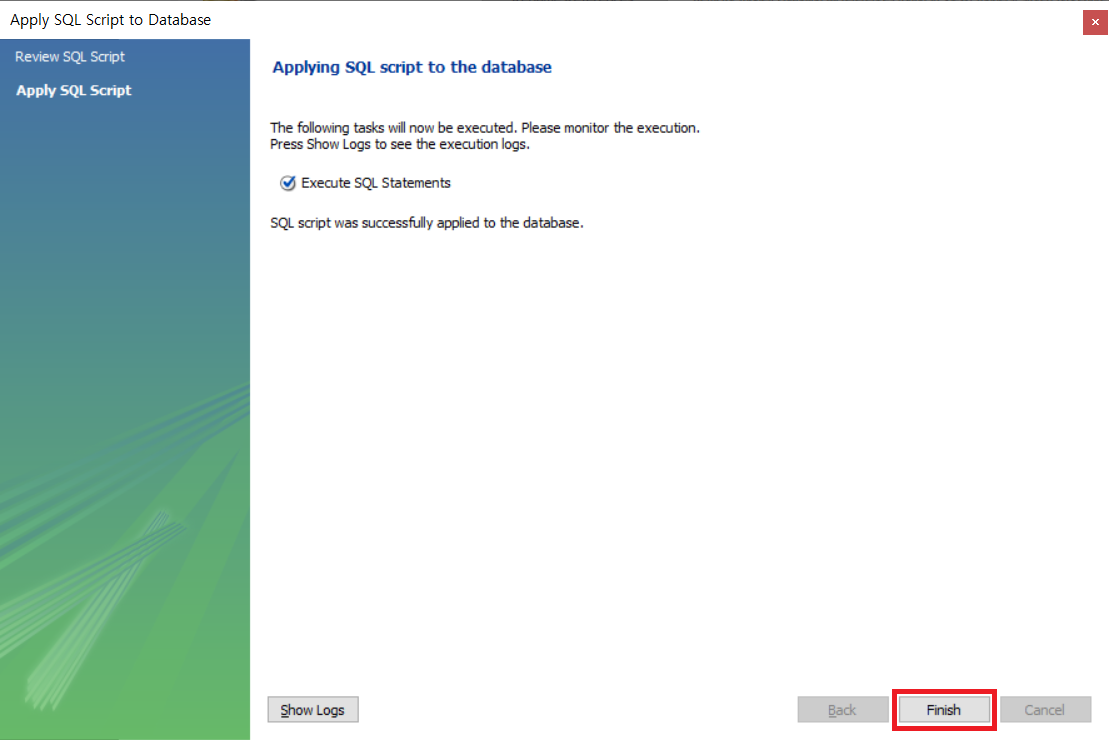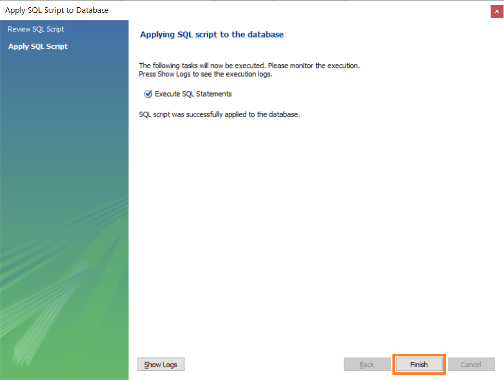 SQL Script를 실행한다는 문구이며, Finish를 누른다.