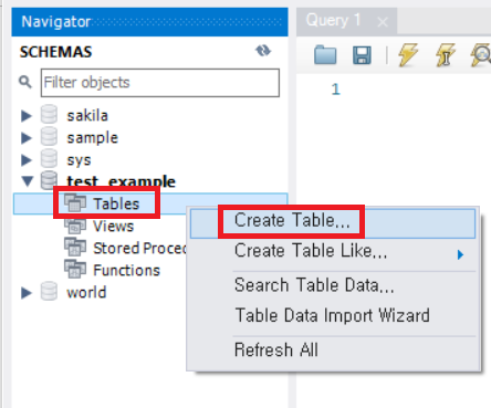 Table 생성을 위해 Tables 오른쪽 클릭을 하고 Create Table…을 누른다.