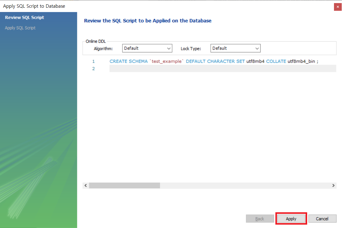 Apply SQL Script to Database 창이 나타나는데, DDL이 이상 없는지 확인 후 Apply를 누른다.