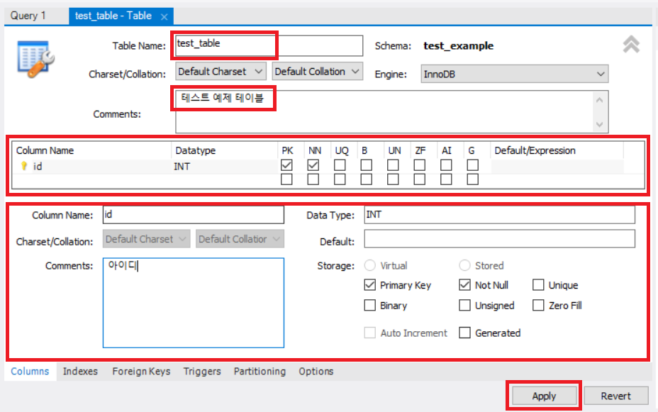 Column Name, Datatype 등 테이블의 구성과 각 상황에 맞는 컬럼을 지정해서 작성하고 작성이 완료되면 Apply를 누른다.