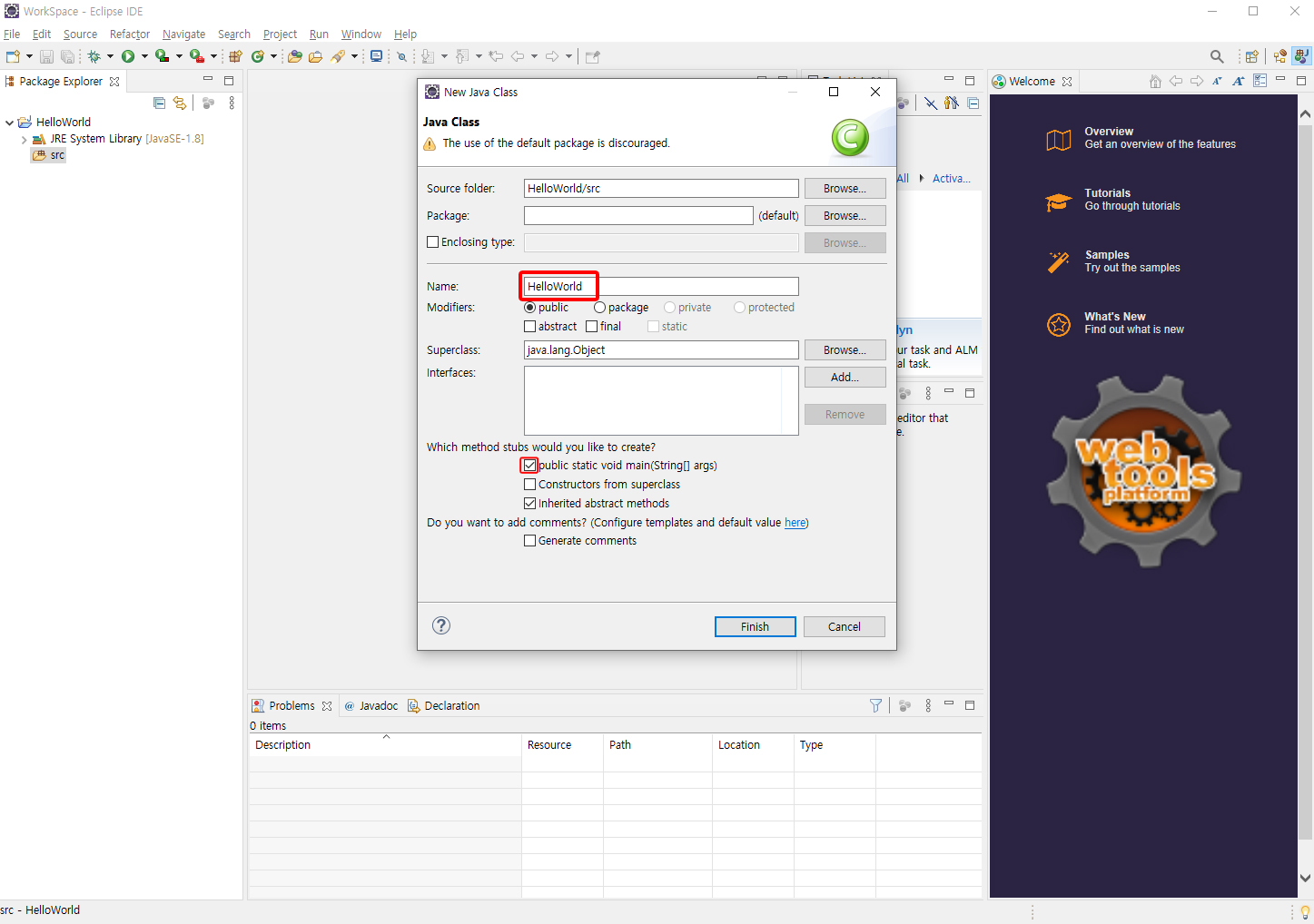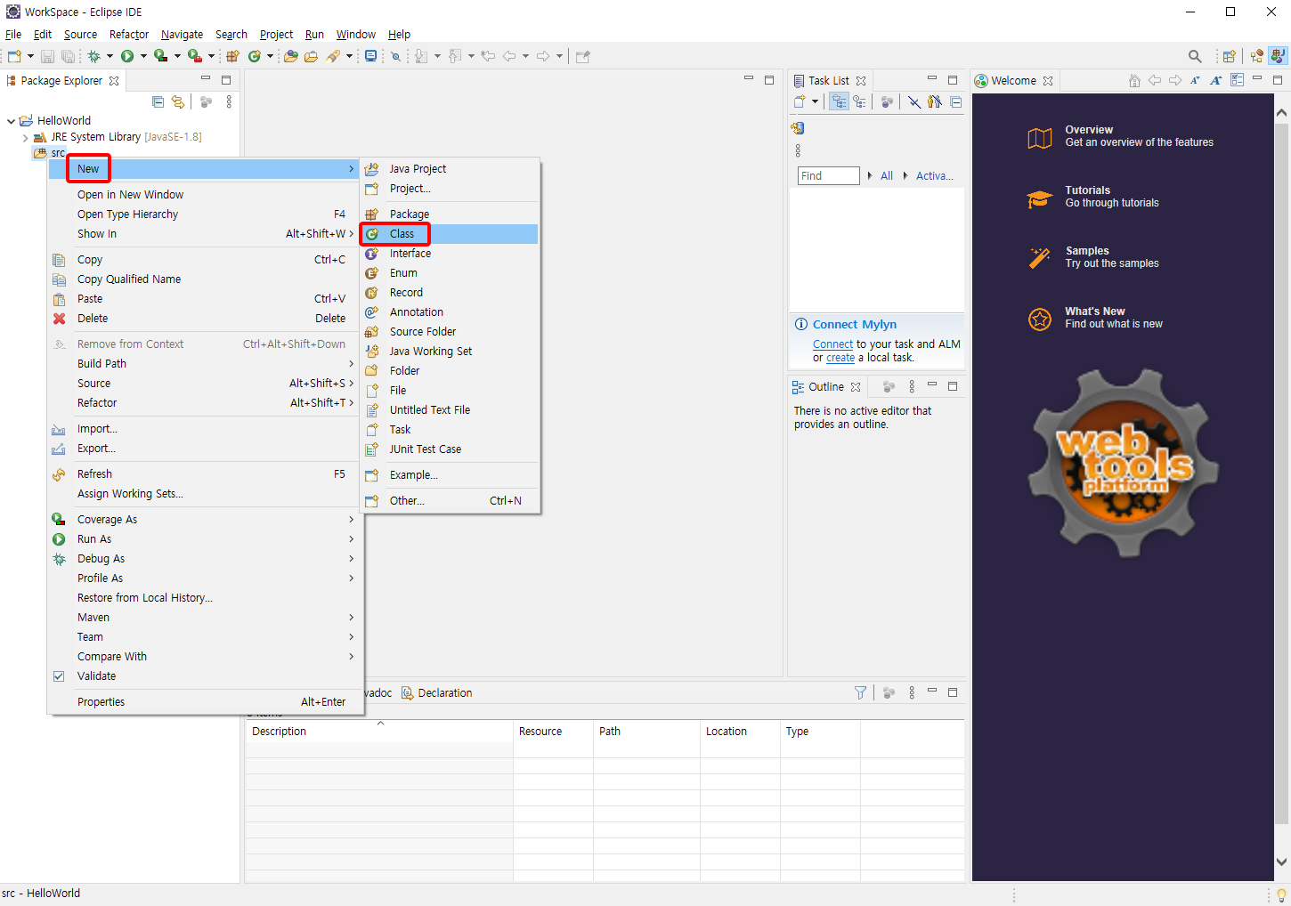 HelloWorld 프로젝트 하위 폴더인 src에 Class를 생성한다.