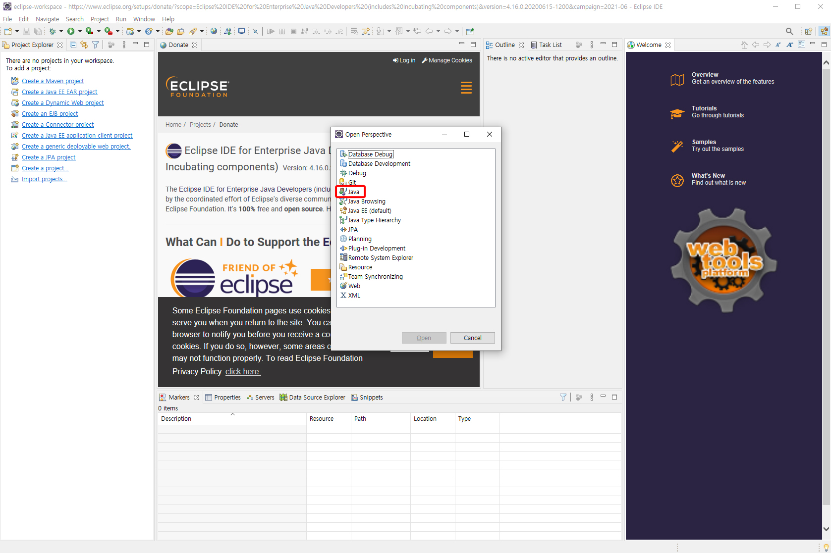 Open Perspective 창이 하나 나타나는데 이클립스의 작업환경(모드)을 설정할 수 있다.