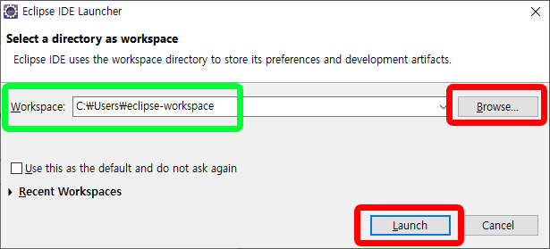 "Browse..."를 통해 원하는 Workspace 경로를 설정할 수 있고