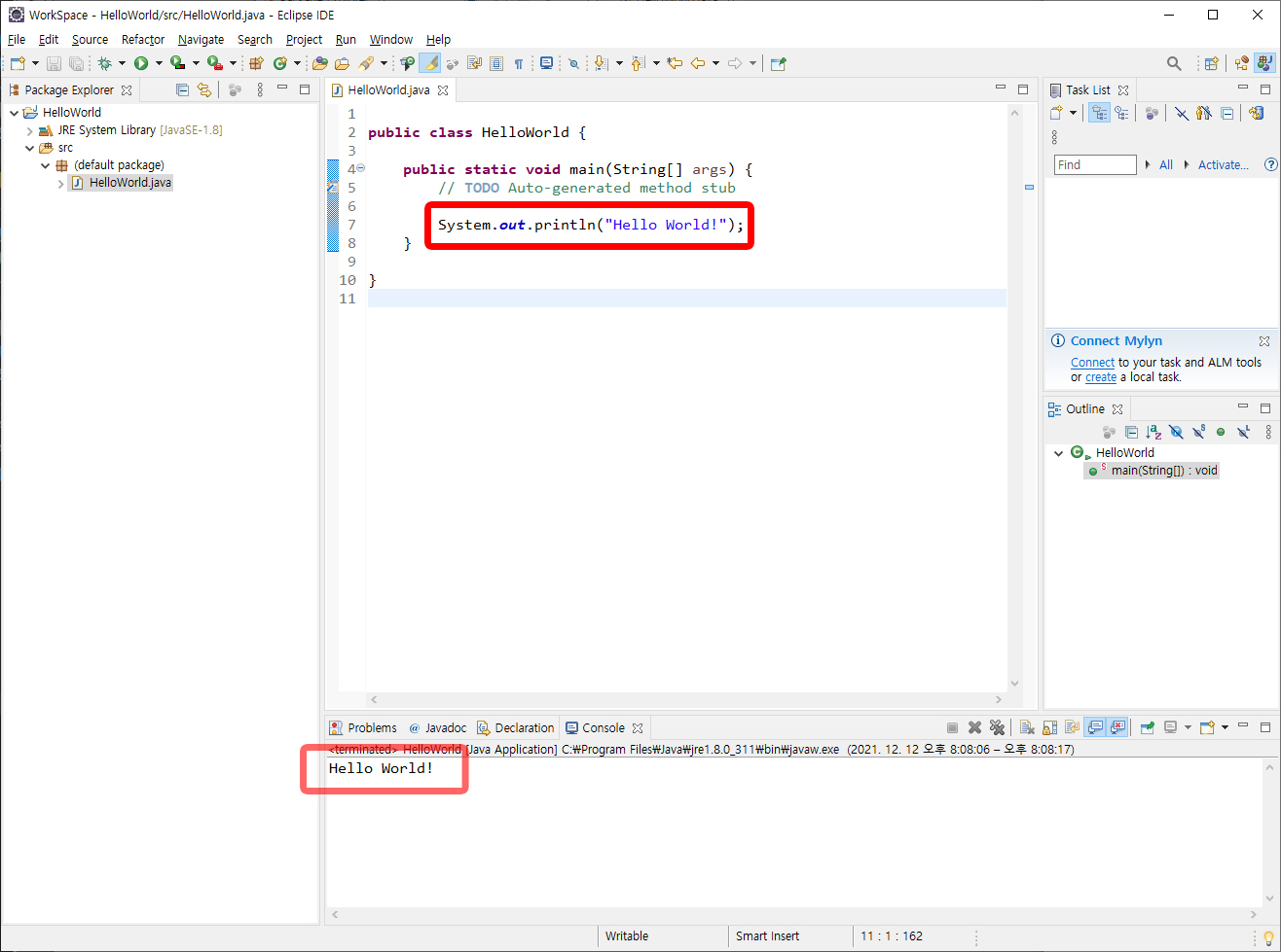 라고 작성을 한 후 'Ctrl + F11'를 누르면