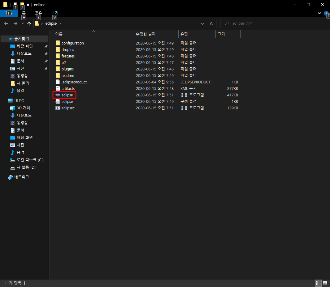 압축 해제가 완료 후 폴더 안에 eclipse를 실행한다.
