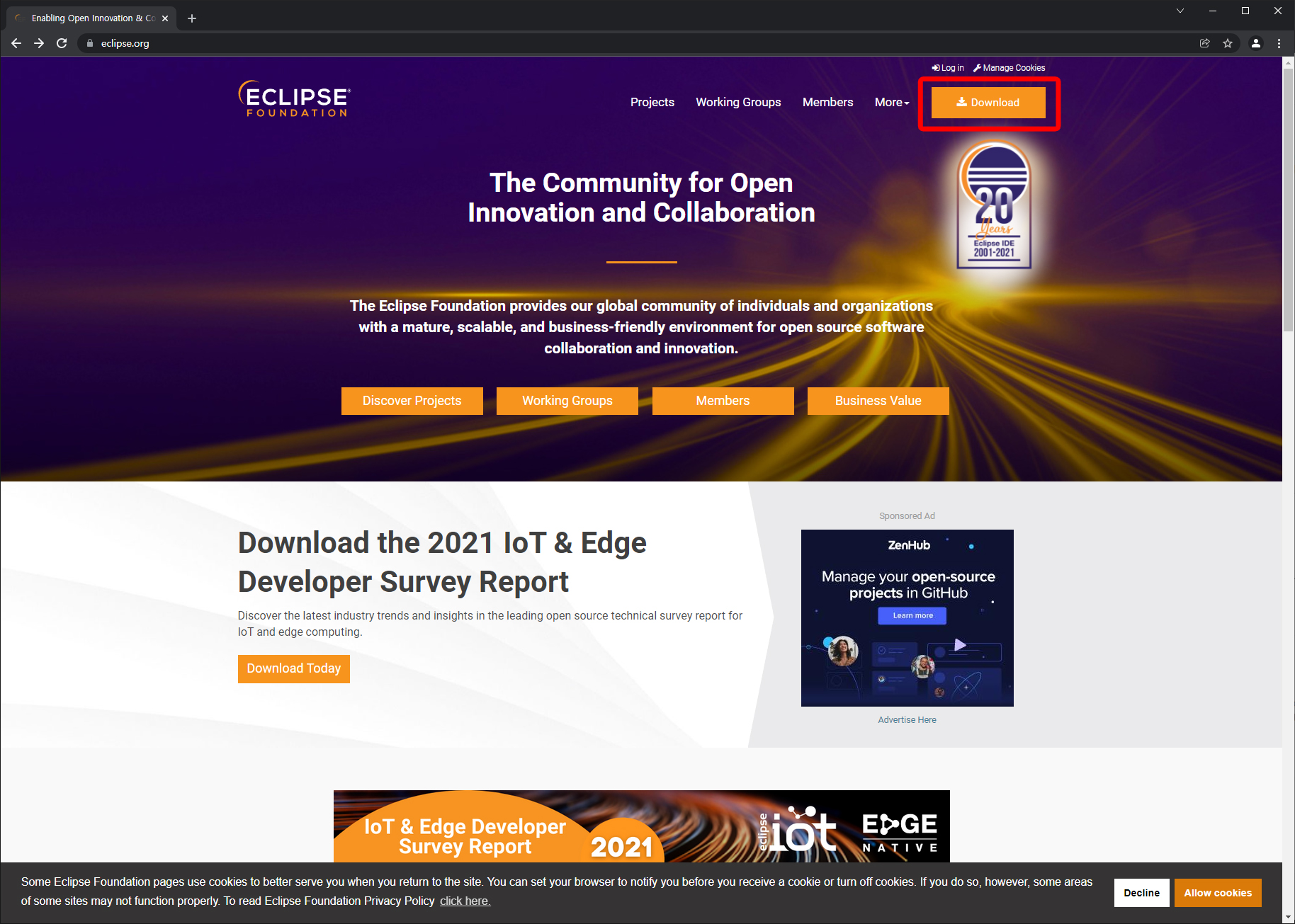 이클립스 홈페이지 상단에 있는 Download를 누른다.